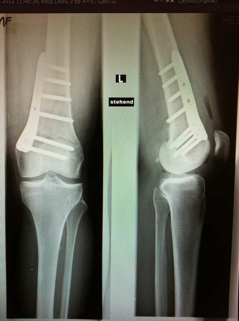 Die vorherigen chronischen Knieschmerzen sind innerhalb der ersten Wochen nach der Umstellung so gut wie weg, dem Patienten bleiben zirka 2-3 Monate Restbeschwerden im OP Bereich.