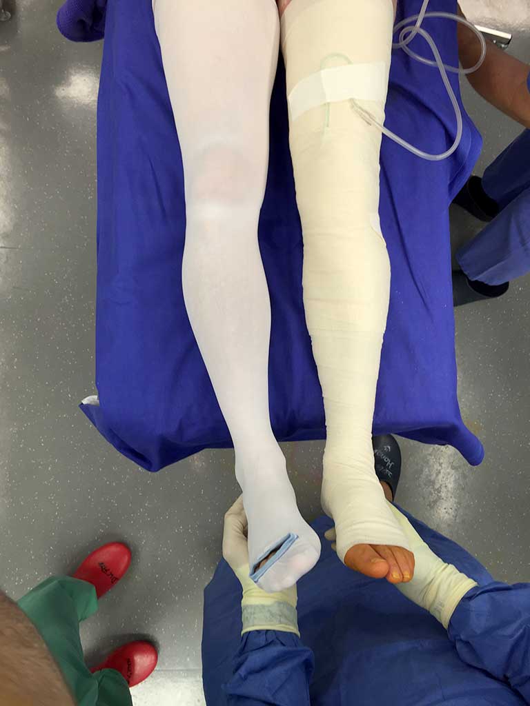 Die Operation dauert zwischen 40 - 70 Minuten, und in unseren Händen wird sie falls notwendig nicht selten mit einem arthroskopischen knorpelwiederherstellenden Eingriff im Knie oder Kreuzbandersatz kombiniert. Dadurch bleibt dem Patienten eine zweite Operation bzw. bis zu 3 Monaten extra Ausfall erspart!