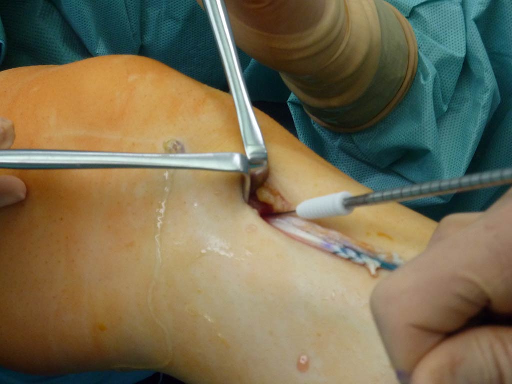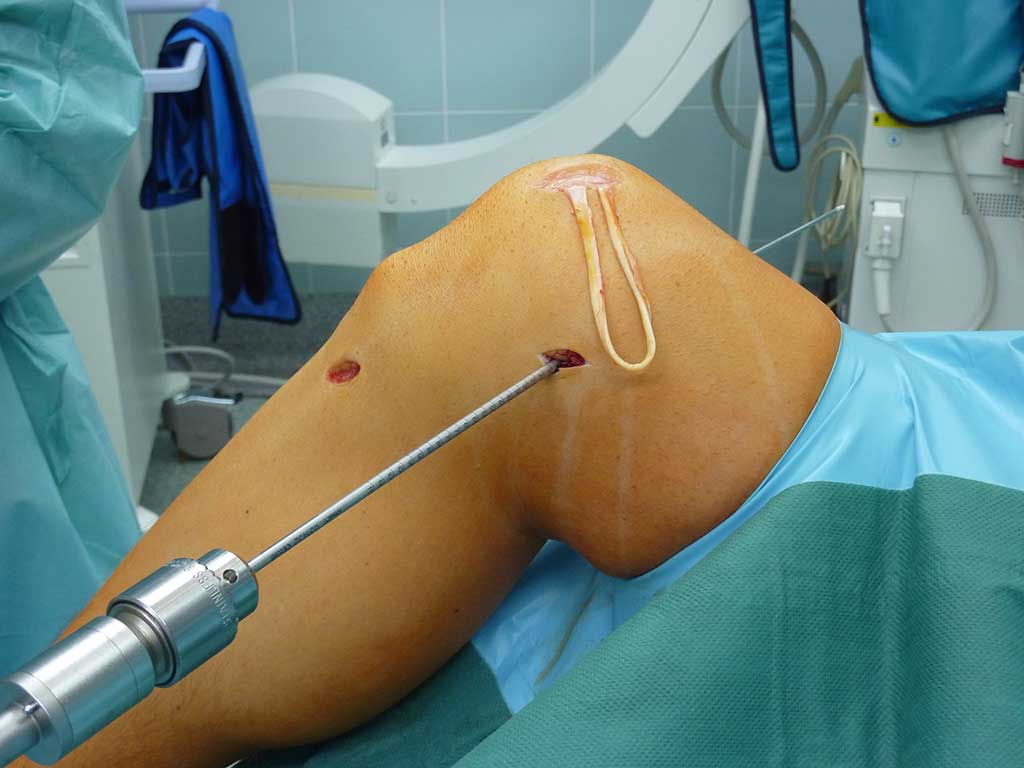 Im Rahmen des ersten arthoroskopischen Eingriffes, welcher unter stationären Bedingungen durchgeführt wird, werden die Transplantatreste aus dem Knie und den Bohrkanälen im Oberschenkelknochen und Schienbein entfernt. Durch 3cm langen Schnitt erfolgt Entnahme vom Spogiosaknochen aus vorderem Beckenkamm und mit diesem Gewebe werden arthroskopisch die alten Bohrkanäle gefüllt (= Spongiosaplastik ).