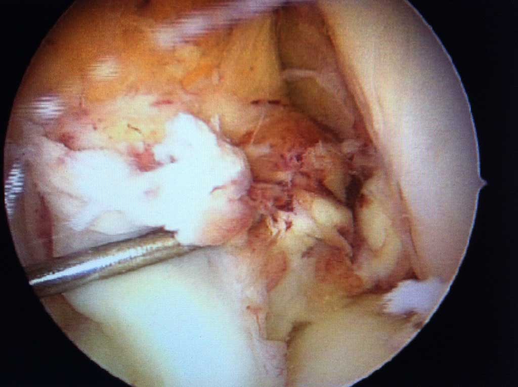 Falls es sich um einen frischen, einige Tage alten, unfallbedingten KS handelt, event. noch mit kleiner knöcherner Schuppe, kann dies durch arthroskopische oder mini offene Operation wieder refixiert ( Minischrauben, Fäden ) werden.