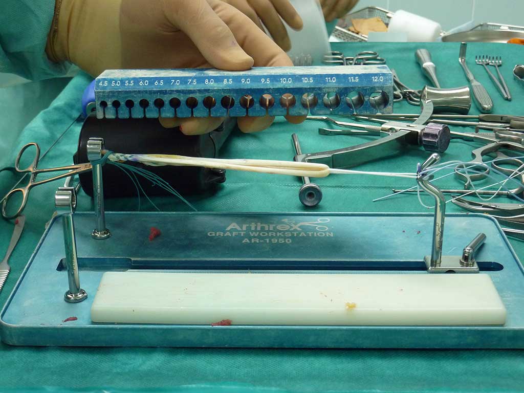 Nach präziser arthroskopischer Anlage von zwei Bohrkanälen jeweils ein im Oberschenkelknochen und Schienbeinkopf, wird das VKB Transplantat aus einer oder zwei körpereigenen Sehnen ( Semitendinosus, Gracilis ) ins Kniegelenk eingezogen und in den Kanälen befestigt.